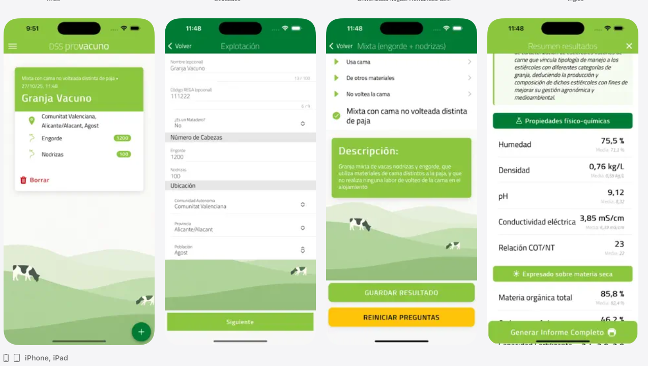 La Organización Interprofesional de la Carne de Vacuno (Provacuno), junto con la Universidad Miguel Hernández (UMH) y la Universitat Politècnica de València (UPV), ha desarrollado la app gratuita Provacuno DSS Manure, disponible para IOS y Android. Esta herramienta permite a los ganaderos categorizar sus granjas y los estiércoles generados, ofreciendo un informe basado en la tipología de manejo y la composición de los estiércoles para mejorar su gestión agronómica y medioambiental.